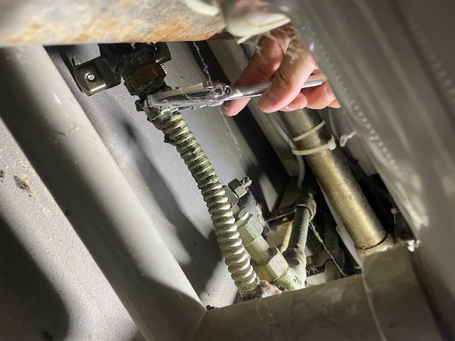 厨房の足元が濡れていることに気が付き、奥にある配管を見るとちょっとずつ水漏れしてきているのがわかりました。
