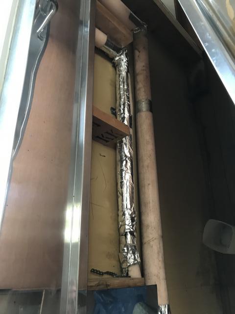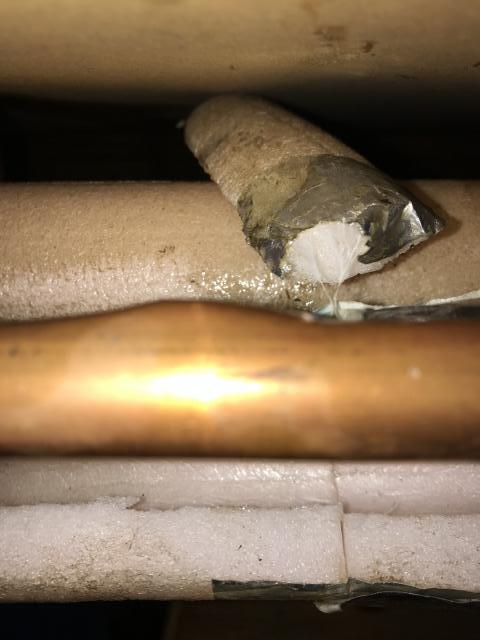 破裂した部分を切り落とし、新しい銅管にて溶接し直し、保温材を巻きなおして難なく改善しました。