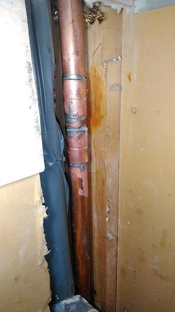 この水漏れしている銅管の一部を切り落とし、新しい銅管で溶接し直して水漏れは改善されました。