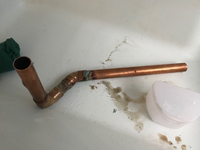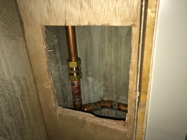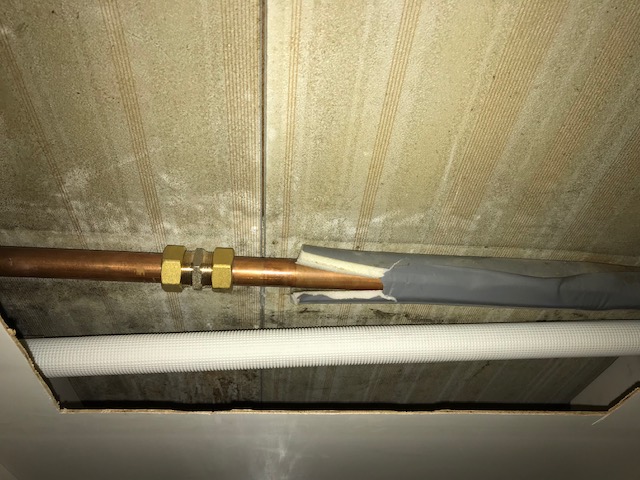 手の届く範囲で配管を切り落とし、溶接が難しい場所のため銅管接続部材を使用して繋ぎなおしました。