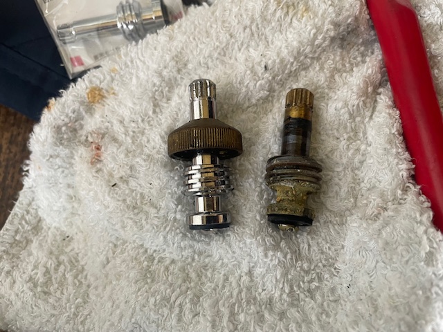 お湯側はパッキン、水側はスピンドルごと交換し水漏れの症状は改善しました。