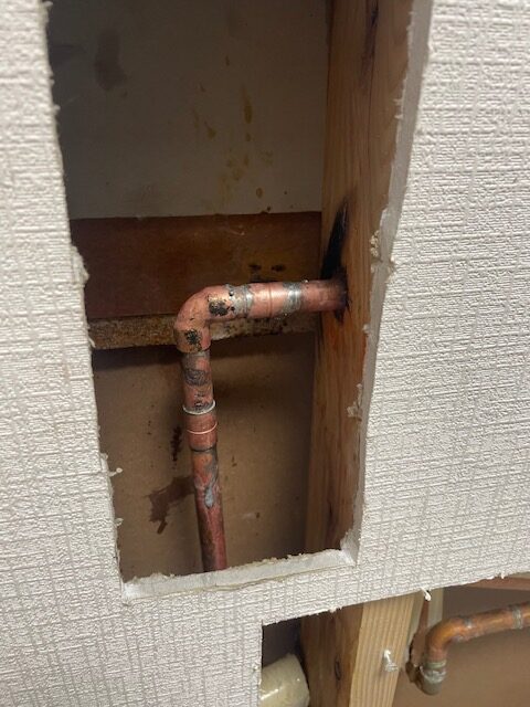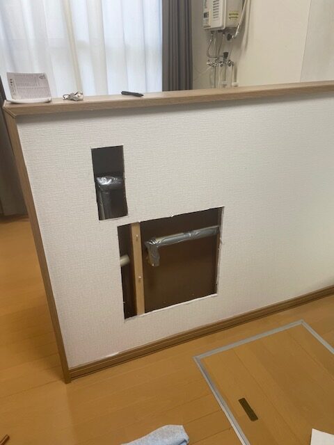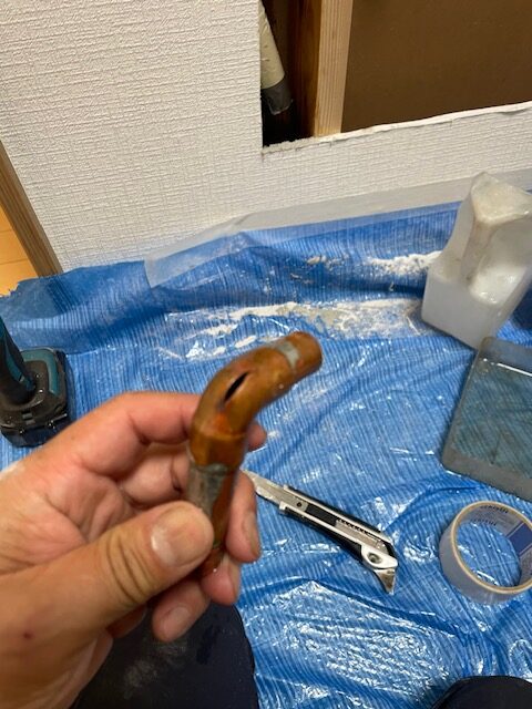 壁の中から漏水音が聞こえた為、開口し水漏れ箇所を特定しました。