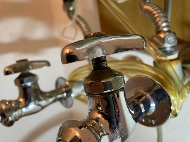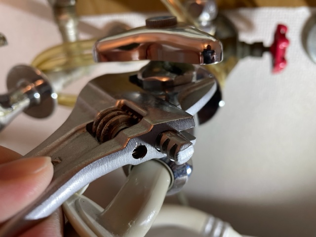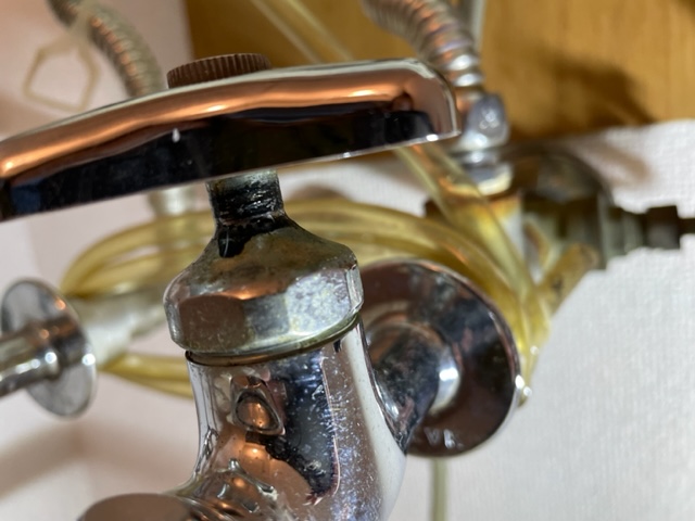 水漏れ箇所は、洗濯水栓のハンドル下のスペースで、ナットの隙間から水漏れしているのがわかります。