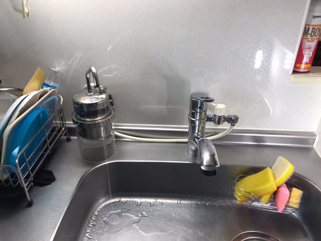 本日は提携企業の依頼で、お客様自身で卓上の浄水器を台所水栓に取付けようとしたが出来なかったので取り付けて欲しいとの事で行ってきました。拝見すると台所ワンホールの混合栓で本体とレバーの間に浄水器用の分岐金具を取り付けて、そこに浄水器の止水ハンドルに接続して使用出来る様になりました。浄水器取付けでお困りの方はいつでもご連絡くださいませ。