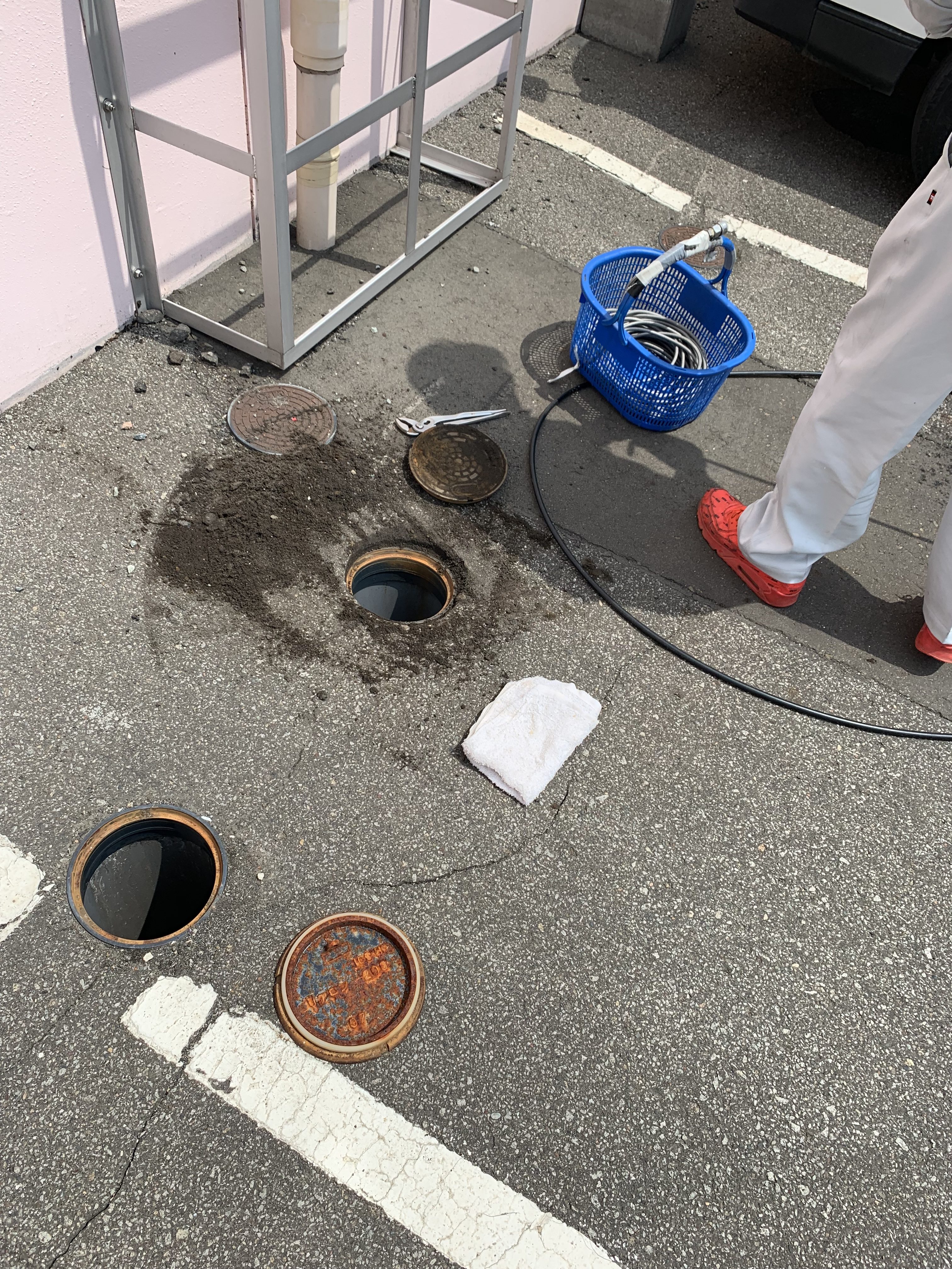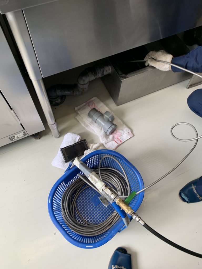 本日は厨房の排水管の高圧洗浄作業をしました。シンクが二箇所ありそれぞれにグリストラップが設置されており、一箇所はグリストラップから溢れることがあるようです。調理師の職員の方の日頃の清掃が行き届いていてグリストラップ自体は見たことがないくらいに綺麗ですね。グリストラップの二次側での詰まりのため高圧洗浄にて作業になりますが、まずは屋外の汚水枡から高圧洗浄しました。油汚れが出てきますがさほど汚れてはいませんね。下流から洗浄管が届かない範囲を今度は上流のグリストラップ側から洗浄していきます。高圧洗浄が完了したところで排水テスト、溢れるようなことはありませんがサイフォン作用が弱いため配管に問題がありそうですね。汚水枡の縦管も一部割れていたため先の地震で横引き管の勾配不良が発生したなどが考えられますが、排水が溢れることはなくなったためお客様の意向で本日は終了です!