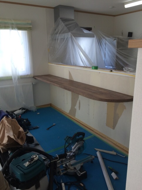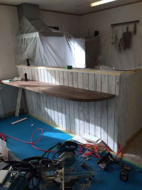 本日は、前に水道の修理を、させて頂いた、お客様の、対面キッチンの羽目板・テーブル施工を致しました。(^^)/前から相談頂いていた件、見積もりやデザインなどを提案させていただき本日施工致しました。まずは、既存のクロスなどを、はがし現場で羽目板やカウンターテーブルの施工工事を、していきました。カウウターテーブルは結構大きいデーブルサイズですので、下地に細工などをして強度を、十分にしていきました。お客様のほうで、アンティーク風のは羽目板やカウンターテーブルが、ご希望で、事前に会社の方で、羽目板に塗装などをしてアンティーク調に研磨やら塗装やらをして結構手間がかかる作業でしたが、施工後、お客様が大変喜んでいましたので良かったです。(^^)