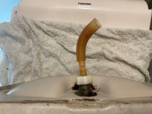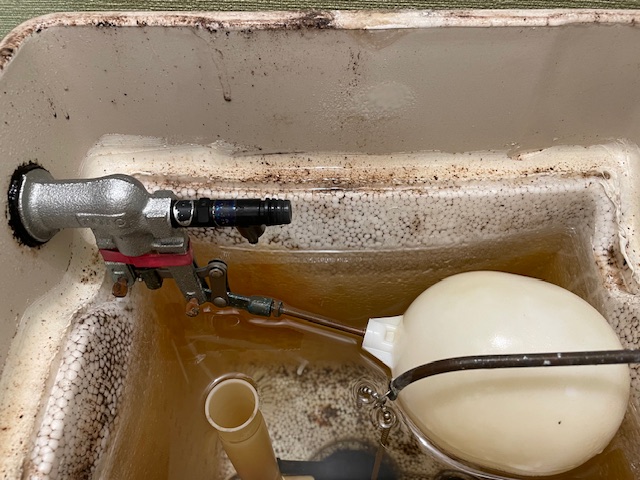 手洗い管につながるホースが外れており、タンク内で飛び散った水がタンクのフタの隙間から漏れていました。