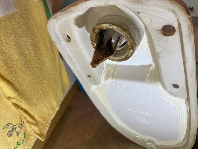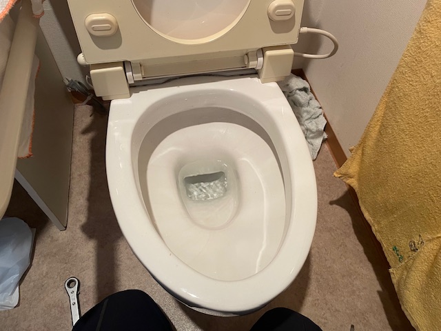 排水ポンプでも改善せず、便器を外してみるとカイロが固まったものが引っかかっており、こちらを取り除いて解決しました。
