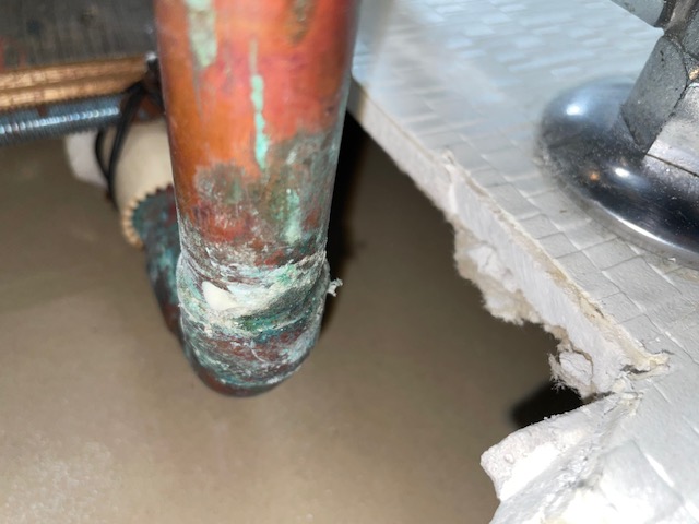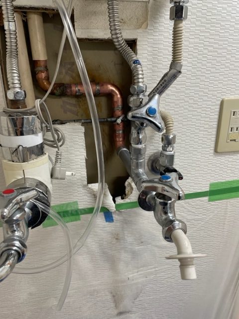 銅管の一部がピンホールしていたため、壁を開口して溶接作業をし、症状は改善しました。