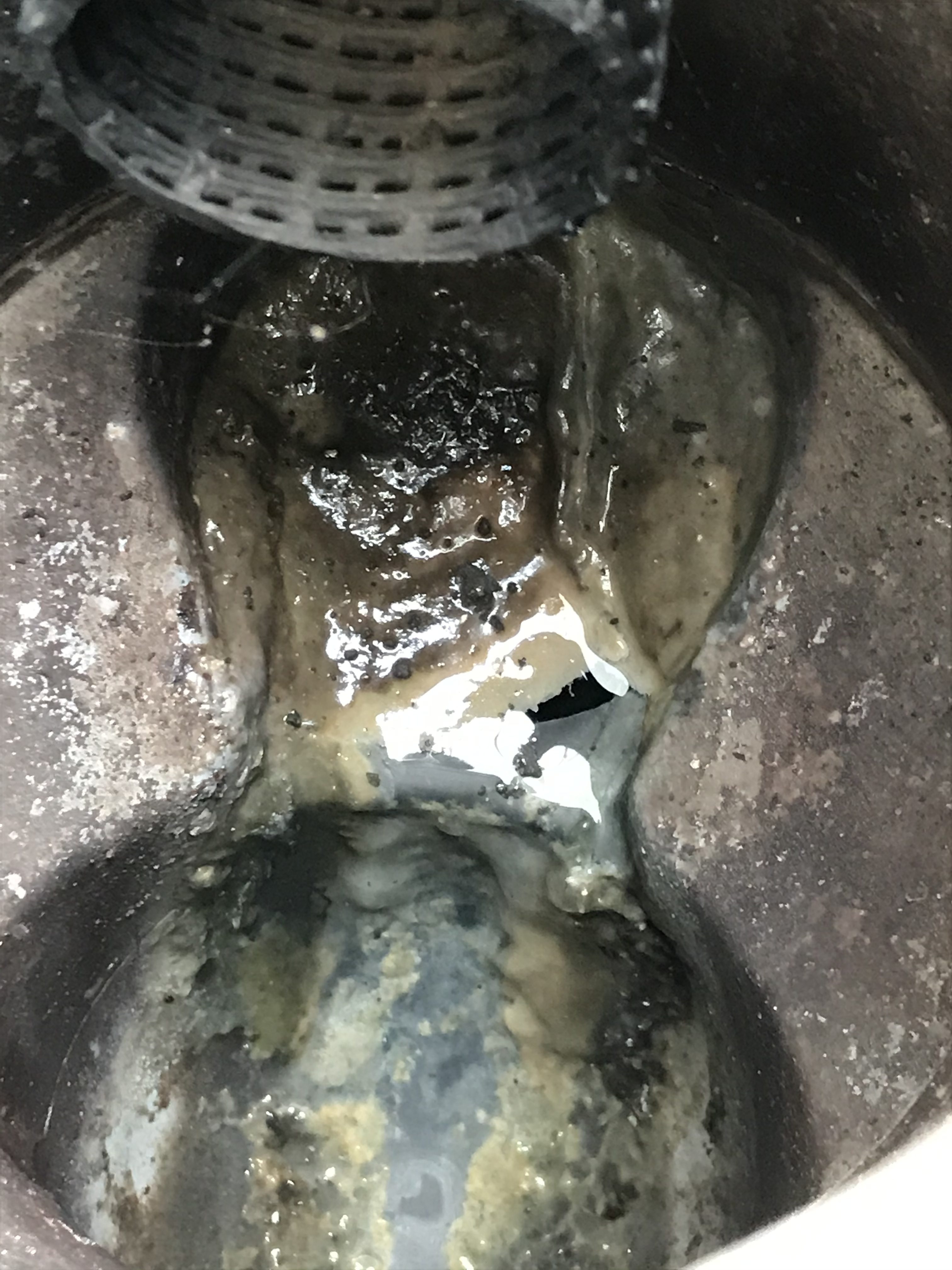 しかし外の排水桝を見てみると、トラップのなっている部分にヘドロや凝固したものが詰まっているのがわかりました。
