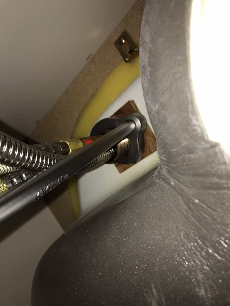 下面より締め付けるタイプのナットでしたので、台所下より潜って工具をあて、しっかり増し締めして改善しました。