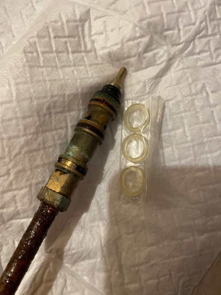 水抜き栓のロットについているパッキンが粉々になっていたため、新しいパッキンを取り付けて改善しました。