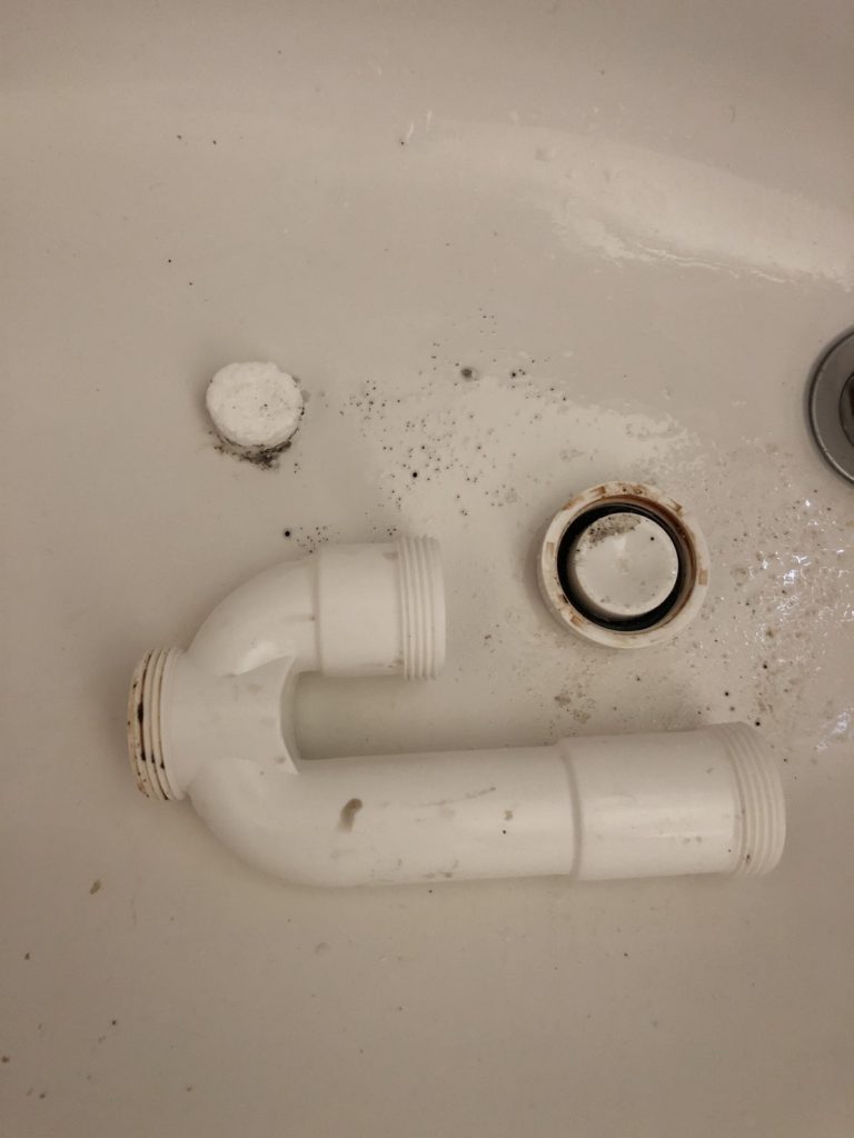 洗面の収納内にあるトラップを取り外して分解し、異物を除去して症状は改善しました。