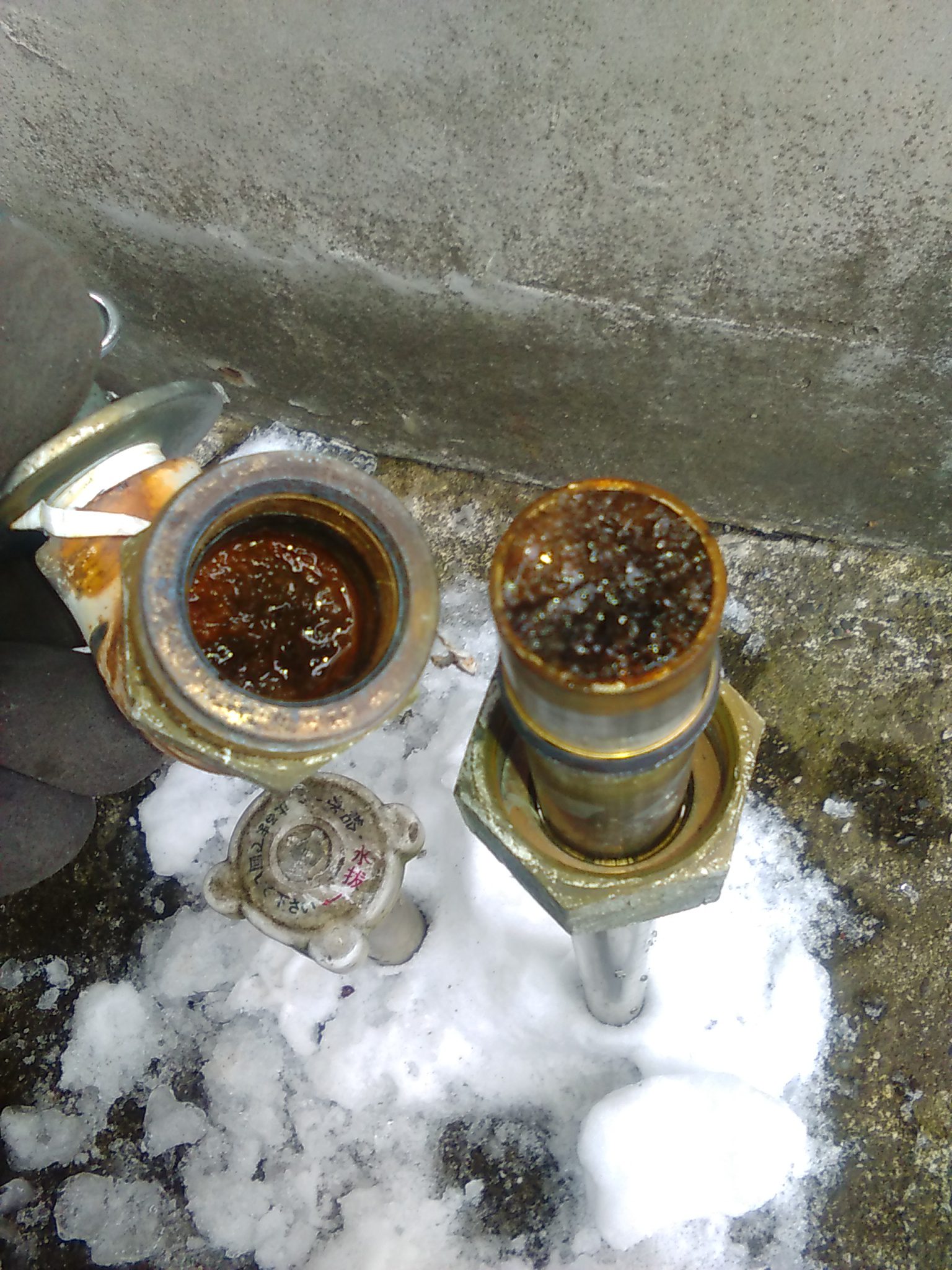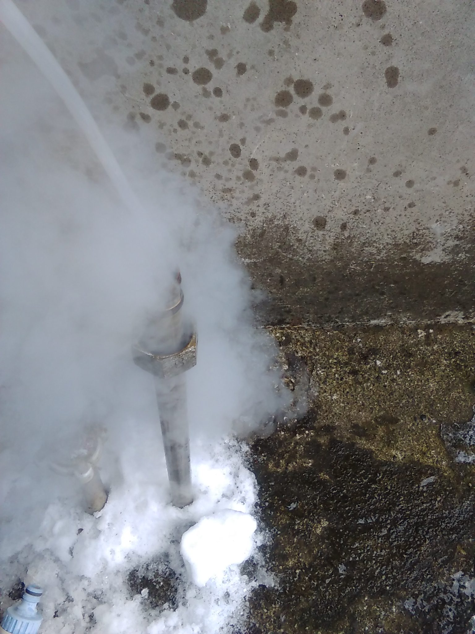 本日は、屋外散水栓の凍結の出動依頼がありました。例年に比べ凍結依頼がくるのが早い気がしますが、散水栓の凍結はこの時期油断していると凍結しますね。こちらのお客様もすっかり水落としするのを忘れてしまっていたようです。今回は吐水パイプのジョイント部分を外して蒸気にて解氷作業しました。お湯をかけるなどの方法もありますが、蒸気解氷が早くて確実ですね!