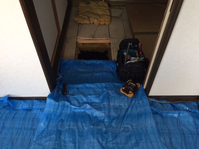 一階の部屋の和室にある畳をよけると点検口があり、そこから床下に潜っていきました。