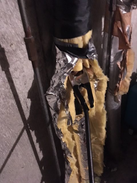 本日は部屋の水が一切出ないとの事でご依頼頂きました、お伺いさせて頂くとどの蛇口も水が出ない状態でした。お客様の部屋は三階で一階部分が車庫になっております。車庫の方でお客様の水道管を分解しましたが車庫部分で凍結していませんでした、そうなるとお客様の部屋と一階車庫の間での凍結ですね(;´Д`)作業としましては凍結ルートの間に電気解氷機を使用しての作業になります。機械を当ててしばらくすると水が少しずつでるようになり作業完了です。