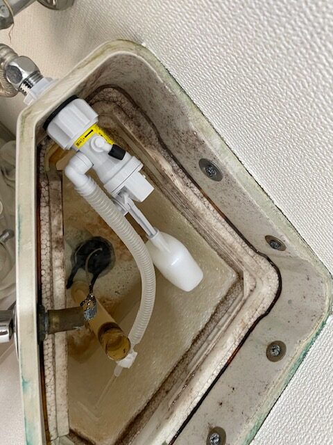 ボールタップの水の止まりが悪くなっており水が流れ続けている状態でした。
