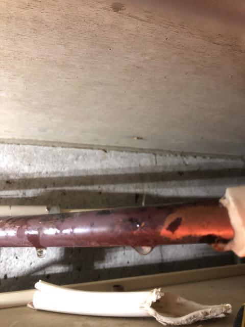 天井裏を覗くと給水管があり、その一部が劣化によって水漏れしている状態でした。