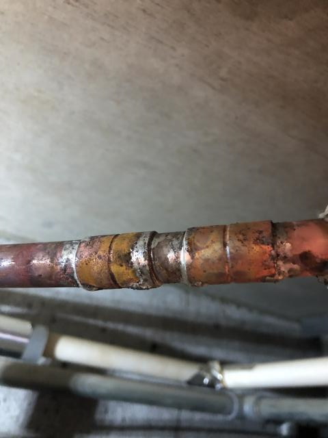 水漏れしている箇所を一旦切り落とし、新しい銅管で接続し直して改善しました。
