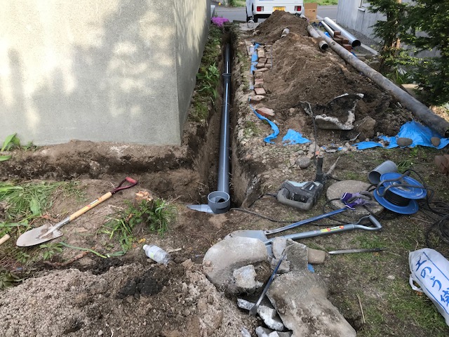 まずは排水経路の土を全部掘り起こし、既存の桝や排水管を撤去します。