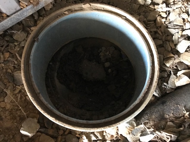 すると、車庫の中に排水桝が一個設置されていましたが、フタが半開きで砂利が盛大に入っていました。