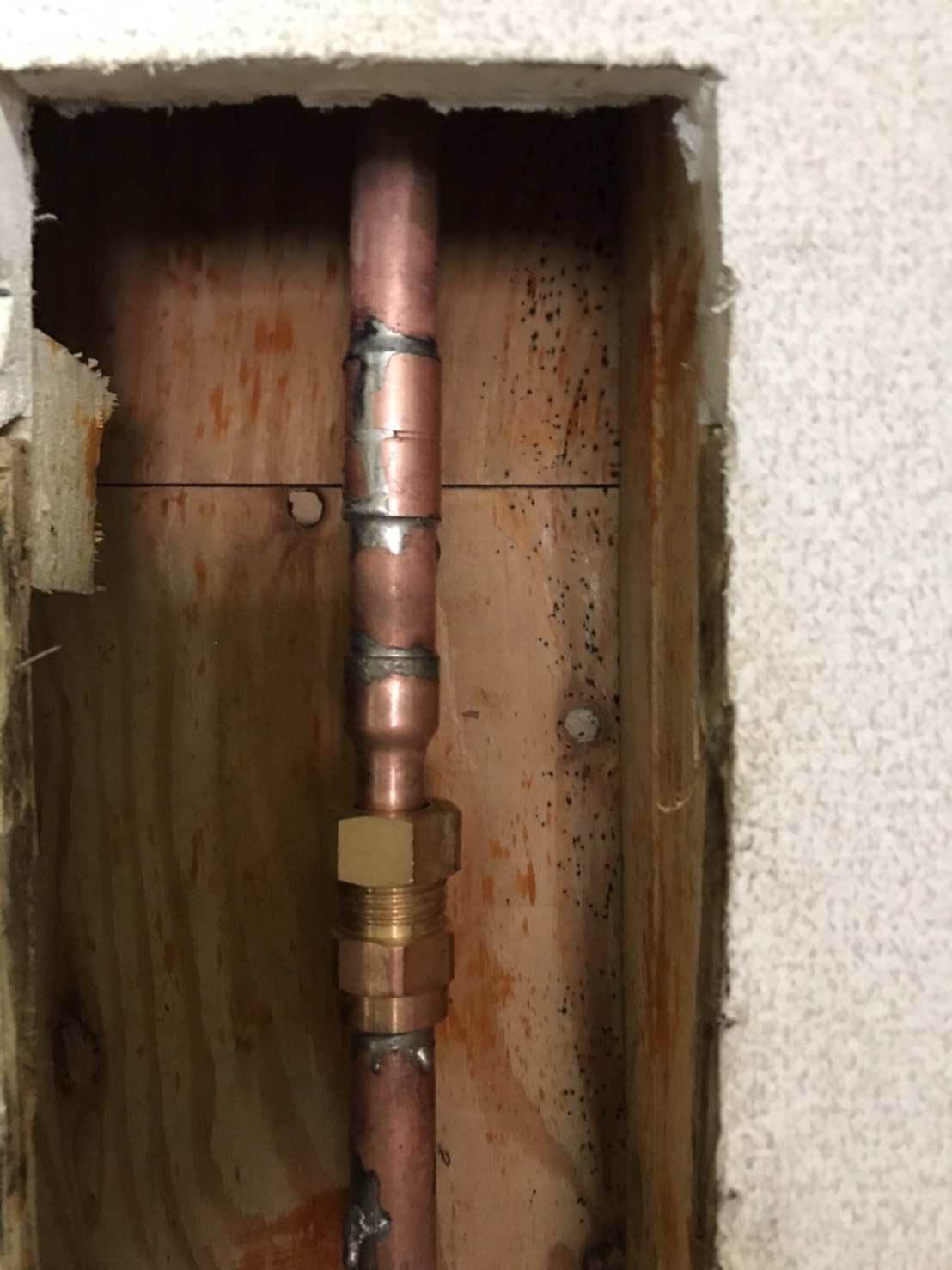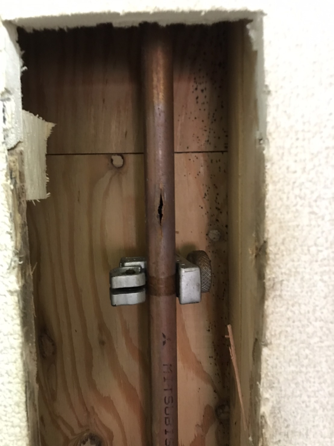 水漏れ箇所は壁の中にある配管で、冬の間に凍結して破裂してしまったものと思われます。