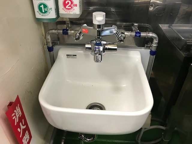 時間は厨房を使用しなくなる夜からの作業で、場所は手洗い専用の蛇口の交換でした。