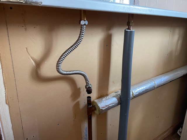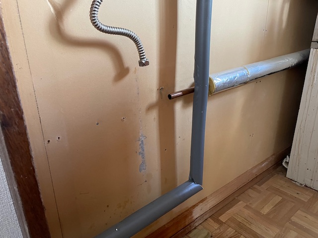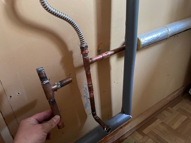 冬の間に配管凍結したみたいで、配管が外れた部分と破裂部分で二か所あり、銅管にて作り直して改善しました。