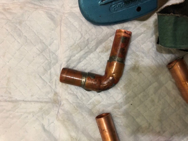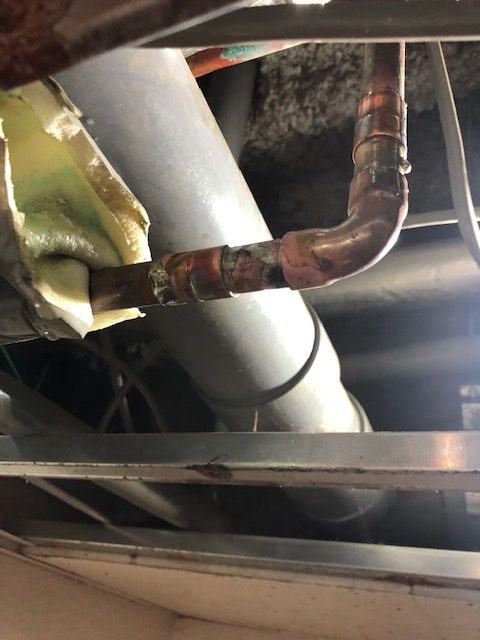 一旦穴の開いた管を切り落とし、新しい銅管を用いて溶接修繕をし症状は改善しました。