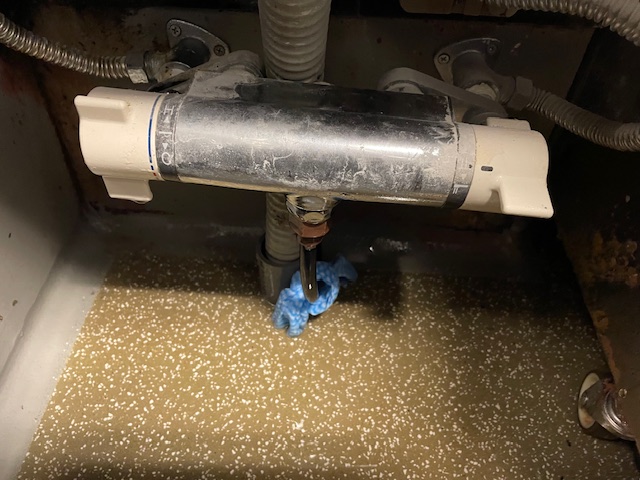 湯水を混ぜる役割のサーモ水栓とフレキの繋ぎ目から水漏れしており、パッキン交換することで改善しました。