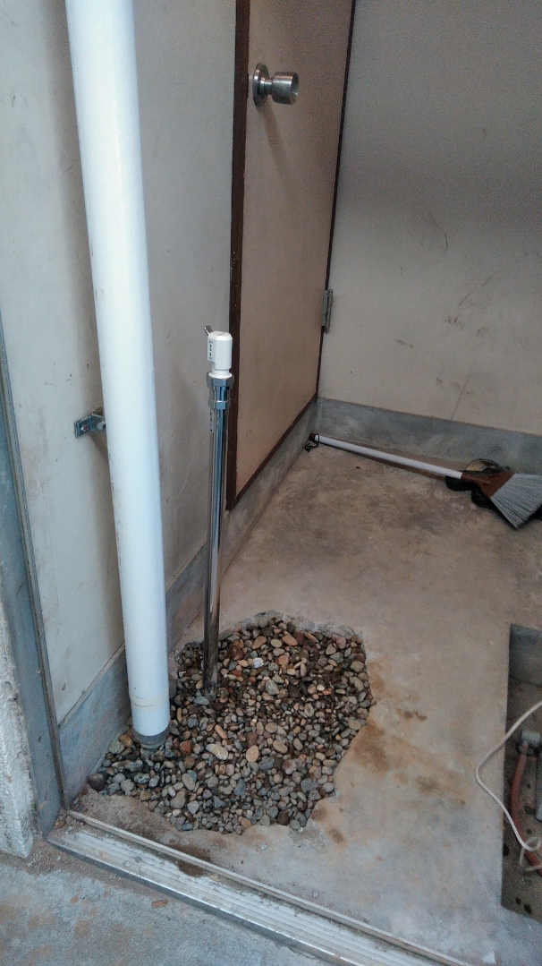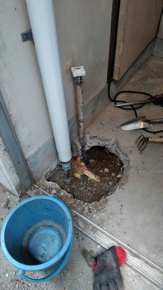 本日は以前トイレ交換した、お客様からの依頼で今度は台所の水抜栓から水が漏れていると水道局から指摘されたので見て欲しいとの依頼で行ってきました。点検すると水抜栓からは漏れている音はしませんが水道メーターは廻っています。これは水抜栓に接続されている立ち上がり管から水が漏れていると思われます。いずれにしても30年以上使用しているのと掘って見ないと分からないので水抜栓交換になりました。コンクリートなのでハンマーで削り約1m掘って真ん中にガス管も有と大変でしたが交換し水漏れは改善しました。お客様も水廻りはいろいろ続くね~と、おっしゃってました。(>_<)