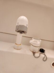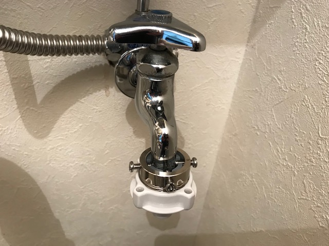 最近は蛇口の先端がワンタッチでつけれるものが増えましたが、これは昔ながらの取り付け方法でした。