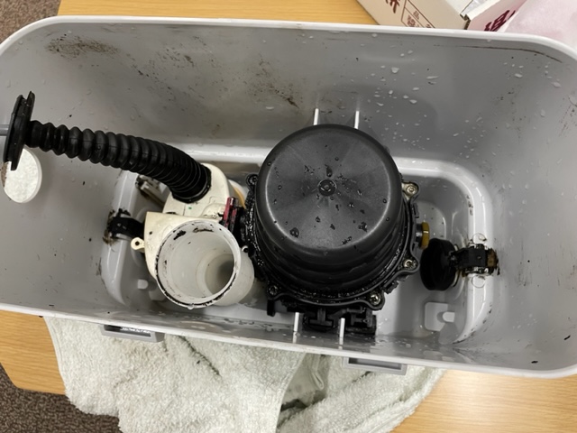 箱自体とポンプ本体を分解して異物を綺麗に洗い流し、再度取り付けて動作確認を行い作業は完了しました。