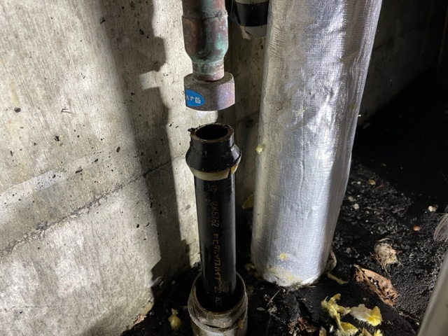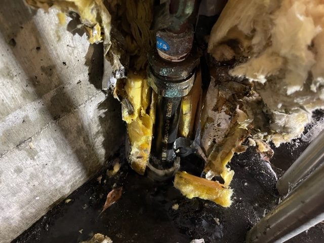 保温材を剥がすと、配管の繋ぎ目の部品から割と多めに水が噴き出していました。