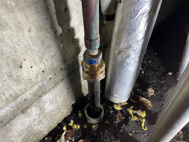 漏れているのはアパートの一階にある車庫内で、保温材が巻いてある配管からの水漏れでした。
