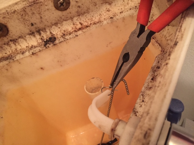 お伺いしてタンク内を覗いてみると、内部のボールチェーンがフックから外れていました。