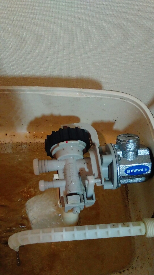 これはボールタップといってタンク内の水を調整する部品が経年劣化で破損して水が漏れている状態でした。ボールタップと水を止める黒いゴム玉を交換