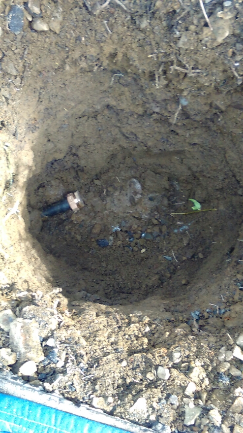 作業的には穴を掘ってメーターから来る管にキャップナットをして埋めて終了です。これで雪が降ろうが槍が降ろうが安心です。