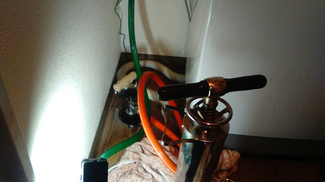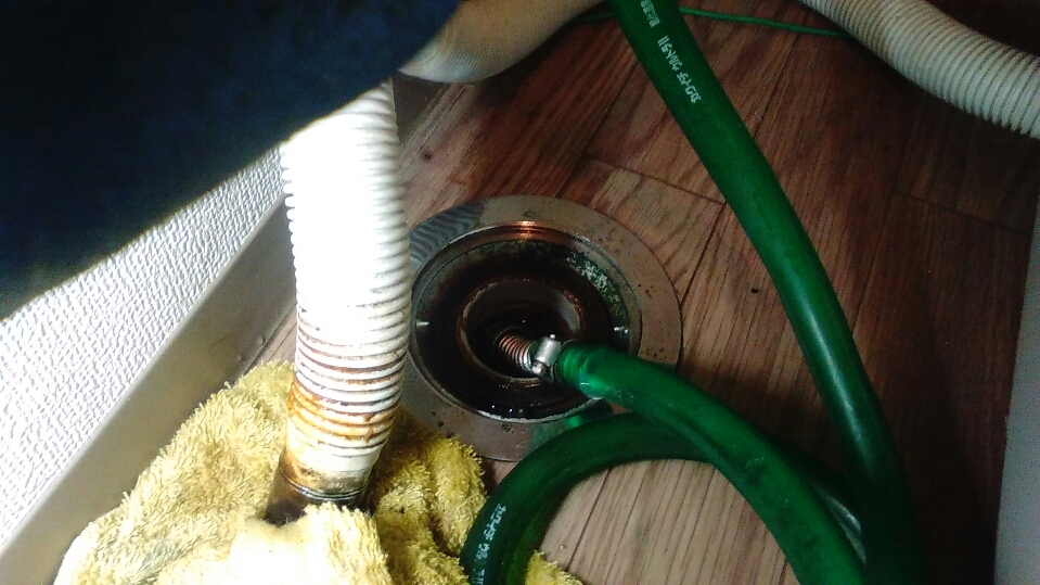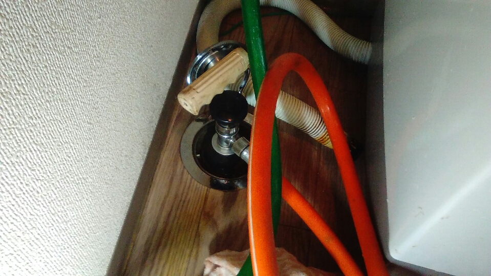 今日は提携会社からの依頼で洗濯排水が溢れて来るので直して欲しいとの依頼で行ってきました。水を排水すると確かに一定の量を流すと溢れてきます。何かが詰まっているのですが見えないのでまずワイヤーを通して確認しましたが排水管の途中の曲がりでぶつかりその先にはいきません。こうゆう時は高圧ポンプで詰まりを押し出します。約3kの圧力の空気圧を配管にかけて解消しました。