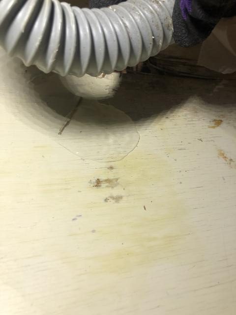 現場を見てみると、一目瞭然とばかりに排水ホースに穴が開いており、水が漏れ出していました。