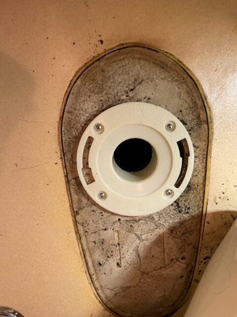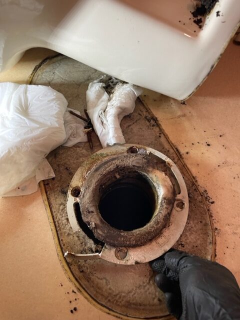 便器を外し、床フランジが劣化により割れて水漏れを起こしていました。