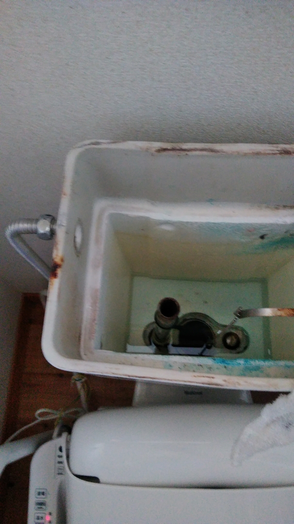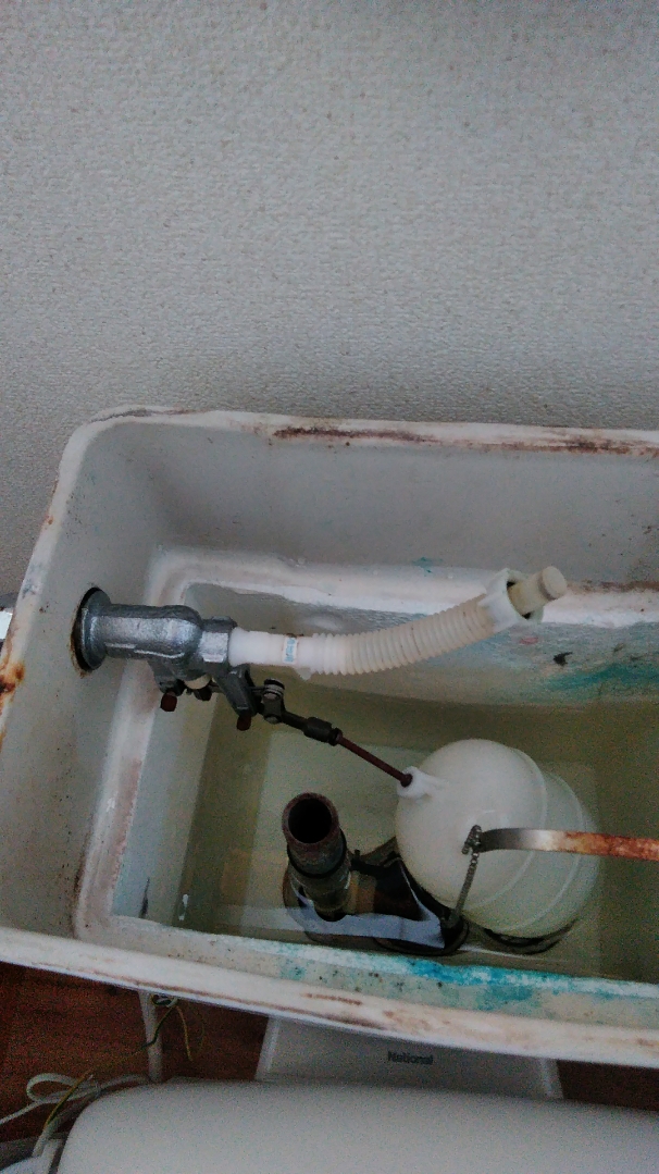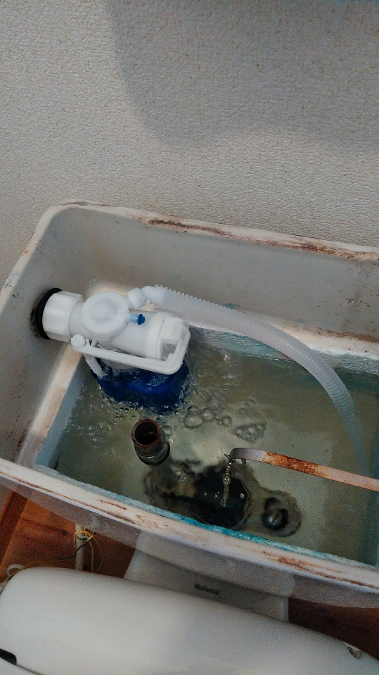 今日は管理会社からの依頼で賃貸物件のアパートのトイレの水がタンクの中でシューシュー水漏れしているので見て欲しいとの依頼で行ってきました。拝見するとタンク内のボールタップと言う部品から水が漏れています。年数も結構古いタイプです。こうなると交換しないと改善しないので管理会社に了承を得て交換し改善しました。