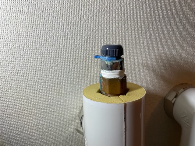 保温材を剥がしても水漏れしている箇所は見つからず、経路を辿るとその上部にある吸気弁より水漏れしていました。