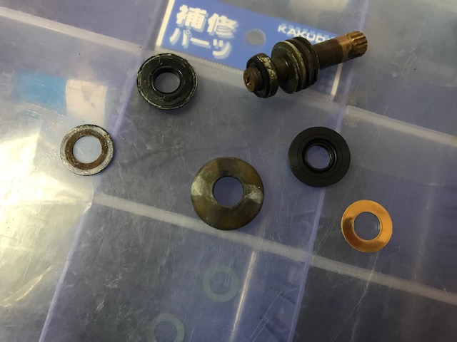 原因はハンドル下にあるナットの中の三角パッキンの劣化が要因となっていました。