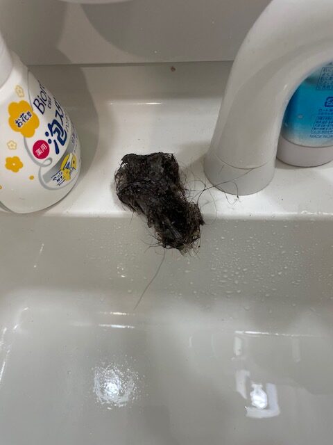 排水トラップ内を確認したところ髪の毛が詰まってしまっていたため除去させて頂きました。