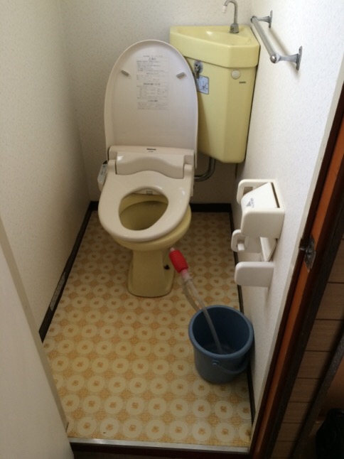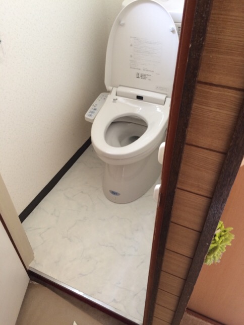 トイレを外してクッションフロアを剥がして、同じ順序でクッションフロアを新しいものに貼ってトイレを設置しました。