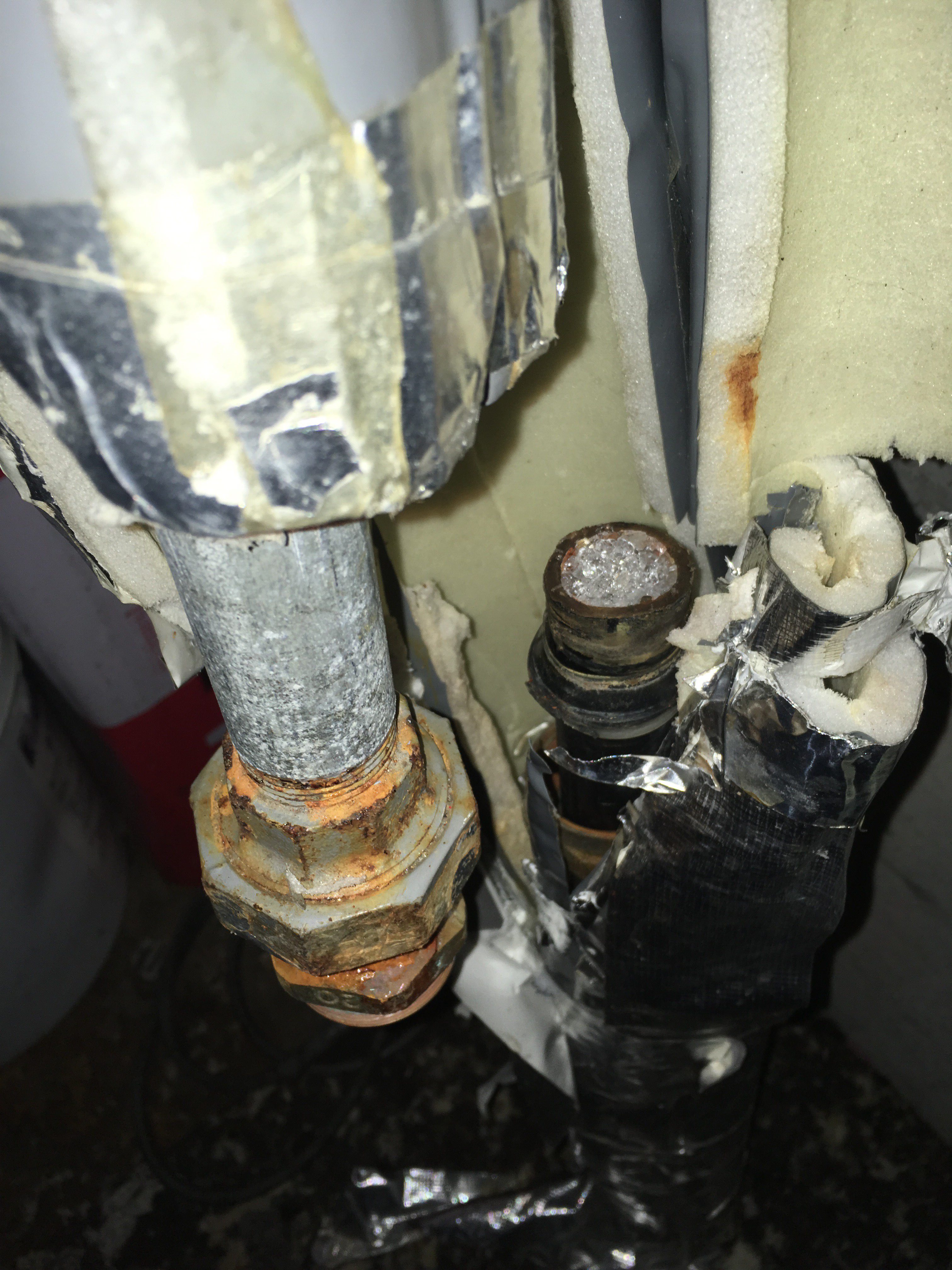本日は蛇口から水が一切出ないとの事でご依頼頂きました。お伺いさせて頂くと水抜栓は開いているのに一切水が出ない状態でした、どこから水が出なくなってしまっているのか調査するために水道管の立ち上がり管を外して見ると外した断面が凍っている状態でした、作業としてはスチーム解氷作業となります、断面に直接高温のスチームが出る管を入れて解氷して外した水道管を接続し直して通水してみると無事水が出るようになりました。もう凍結のピークは過ぎましたが夜はまだまだ冷え込んでいるので注意が必要ですね(;´Д`)
