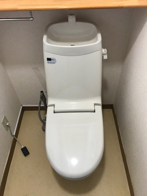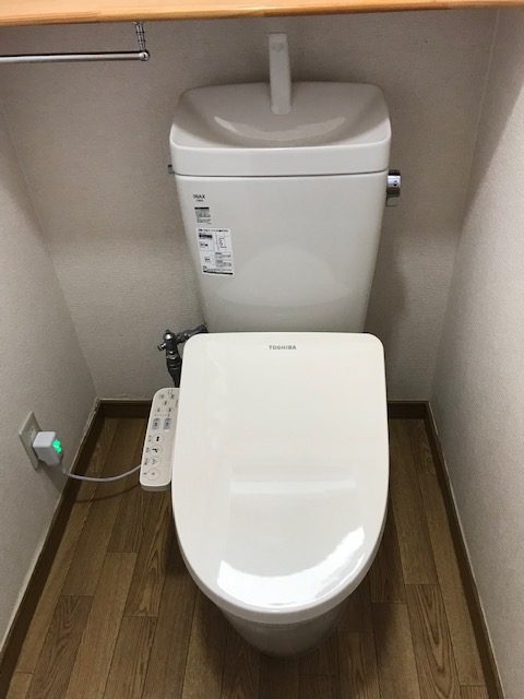 交換当時はトイレを外して決めたデザインのCFに張り替え、新しいスタンダードなトイレに取り付け直して完成です。