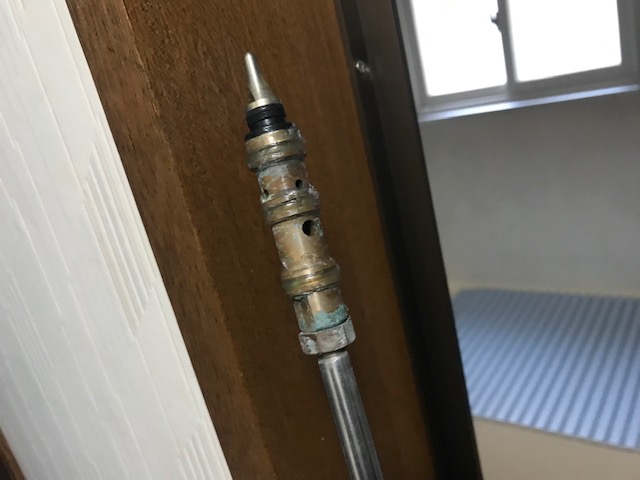壁を開口すると、二部屋分の電動水抜き栓が発見され、該当する水抜き栓のパッキンを交換して漏水は改善されました。