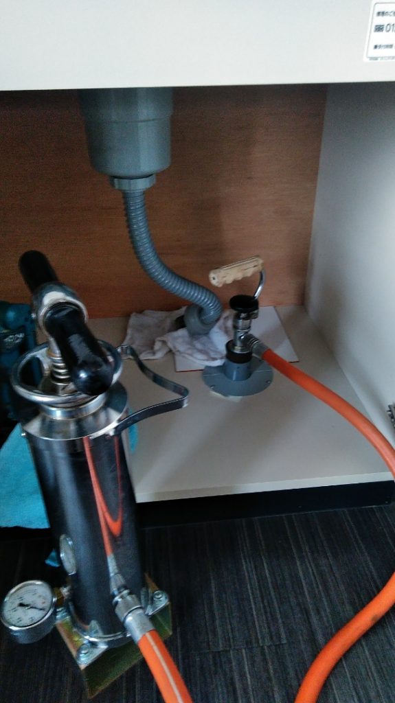 今日は管理会社からの依頼で賃貸マンションの台所シンク下が水を排水したら水が排水口から溢れてくるので見て欲しいとの依頼で行ってきました。拝見するとシンク下の蛇腹ホースと排水管の間に隙間があり排水管の奥で汚れ、食べ物が詰まっているので水が溢れる状態です。まずは排水管の詰まりを解消するのに高圧ポンプで詰まりを抜き隙間をテープで補修し改善しました。
